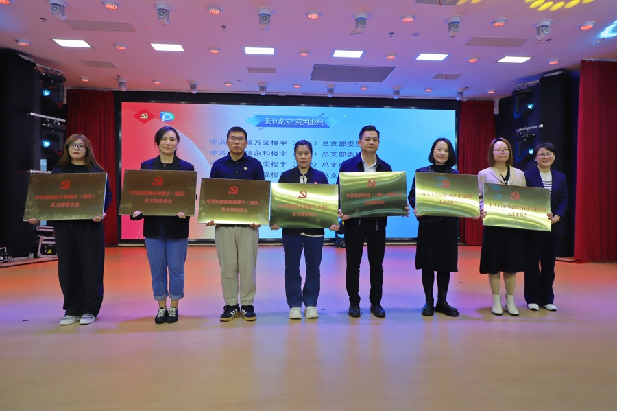 “聚心——党建凝魂”环节展示了党建全覆盖底图,直观呈现了基层党组织网络在居民区、街区、楼宇、园区的全面覆盖。中共彭浦镇万荣楼宇(园区)总支部委员会、中共彭浦镇永和楼宇(园区)总支部委员会、中共彭浦镇塘南楼宇(园区)总支部委员会、中共彭浦镇幸福楼宇(园区)总支部委员会等7个最新成立的党组织代表上台接受授牌,标志着彭浦镇党建工作迈入新阶段。